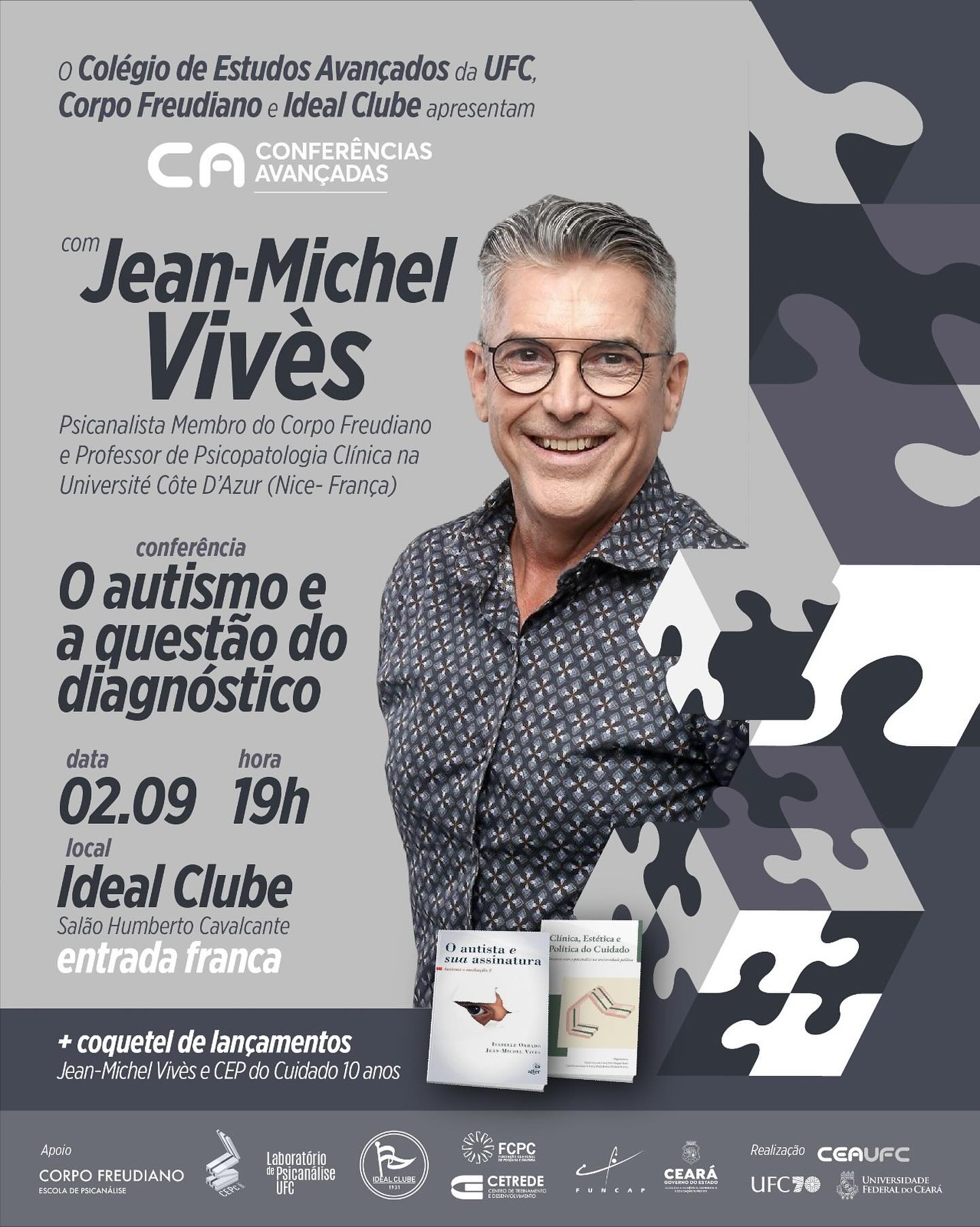 Data da publicação: 26 de agosto de 2025 Categoria: NotíciasO Colégio de Estudos Avançados da UFC realizará, no dia 2 de setembro de 2025, a Conferência “O autismo e a questão do diagnóstico” e lançamento de livros. A iniciativa conta com o apoio do Corpo Freudiano Escola de Psicanálise, do Laboratório de Psicanálise da UFC, do Ideal Clube e do CEP do Cuidado.